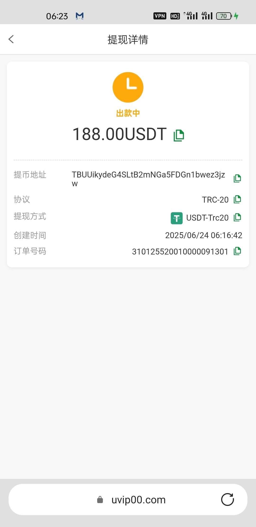 我领到了18U打到了188正在出款中,不知道能不能到网址U.VIP