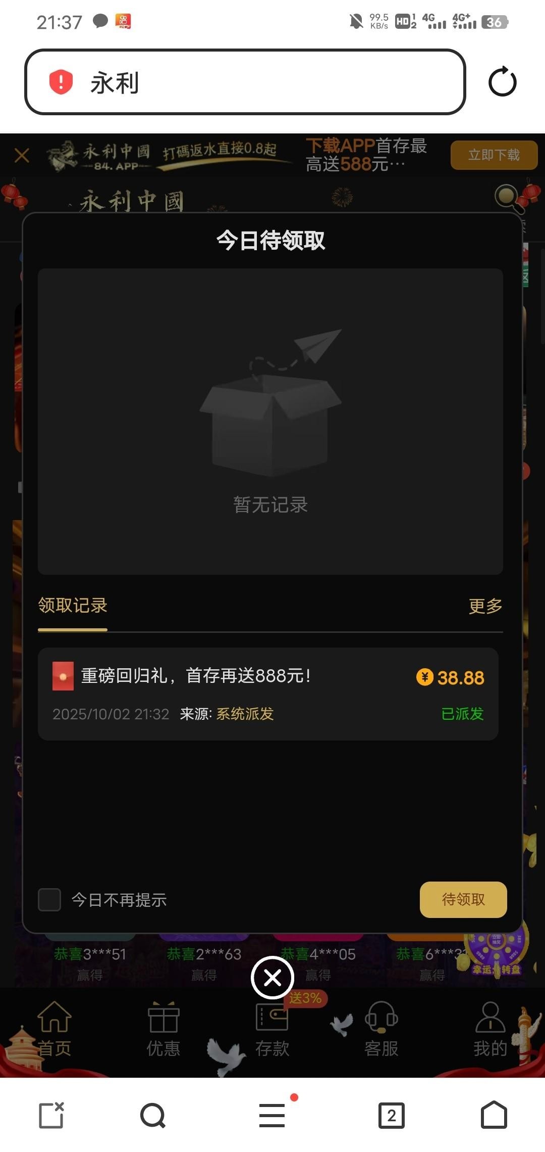 【永利84】回归彩金