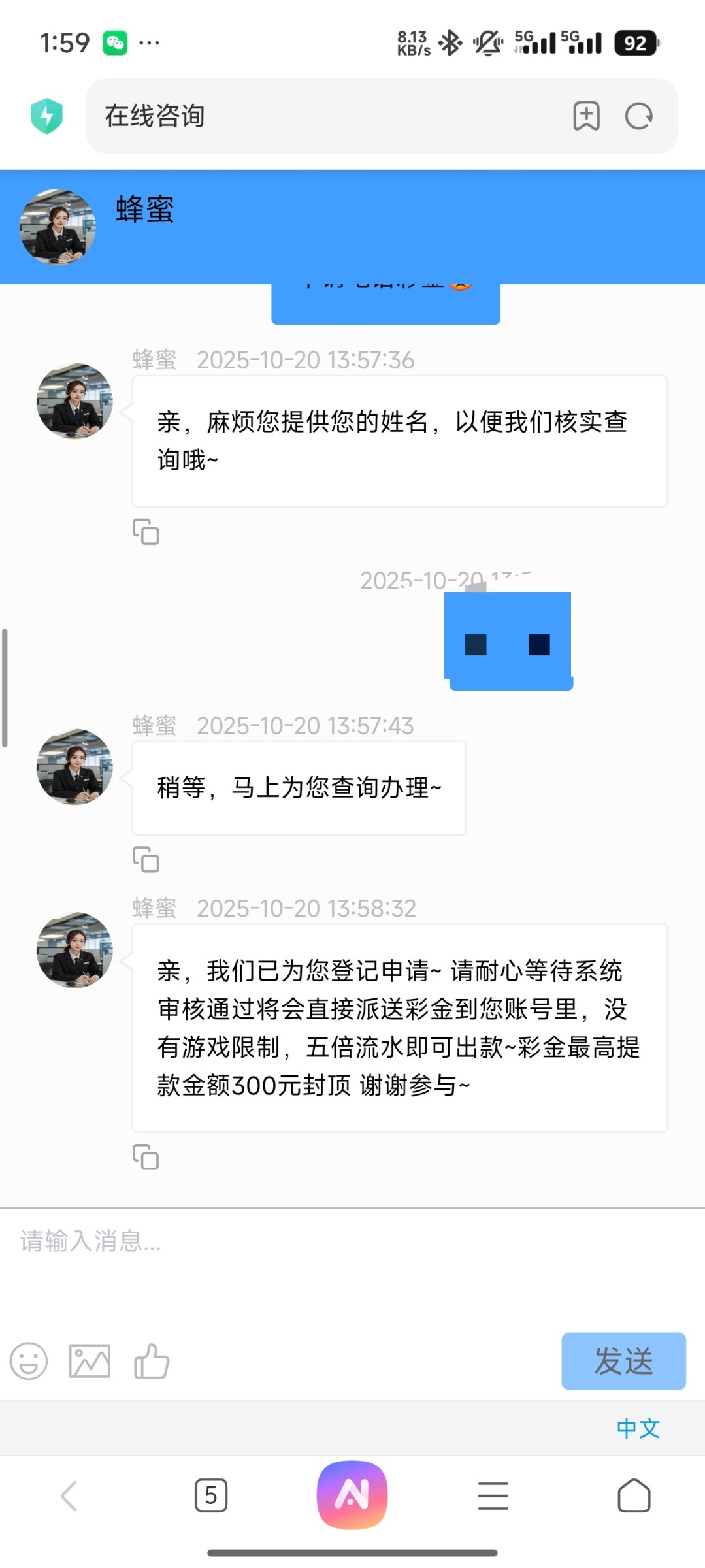 我是打电话去的,注册给客服发账号发手机号送55碰到的话游戏限制问客服