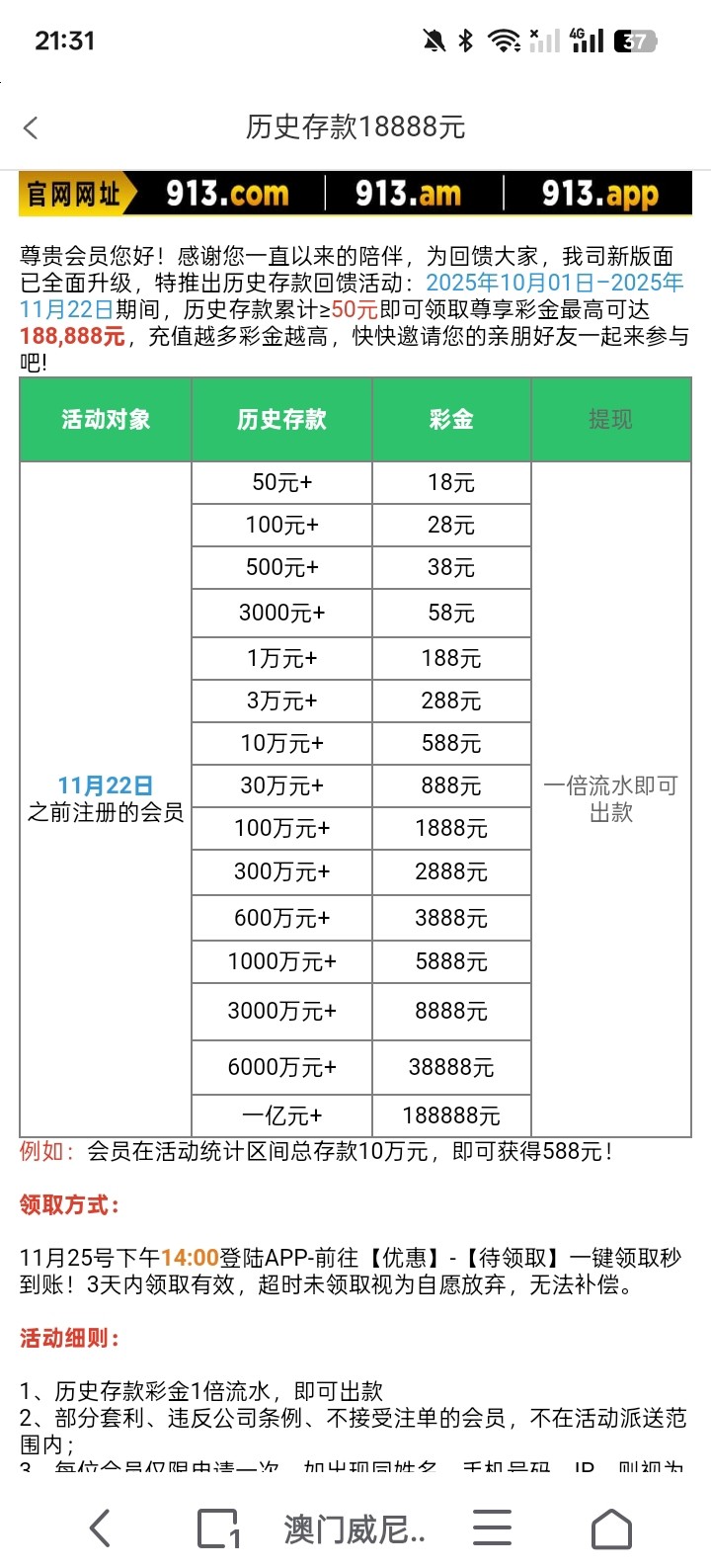 【威尼斯913】升级彩金