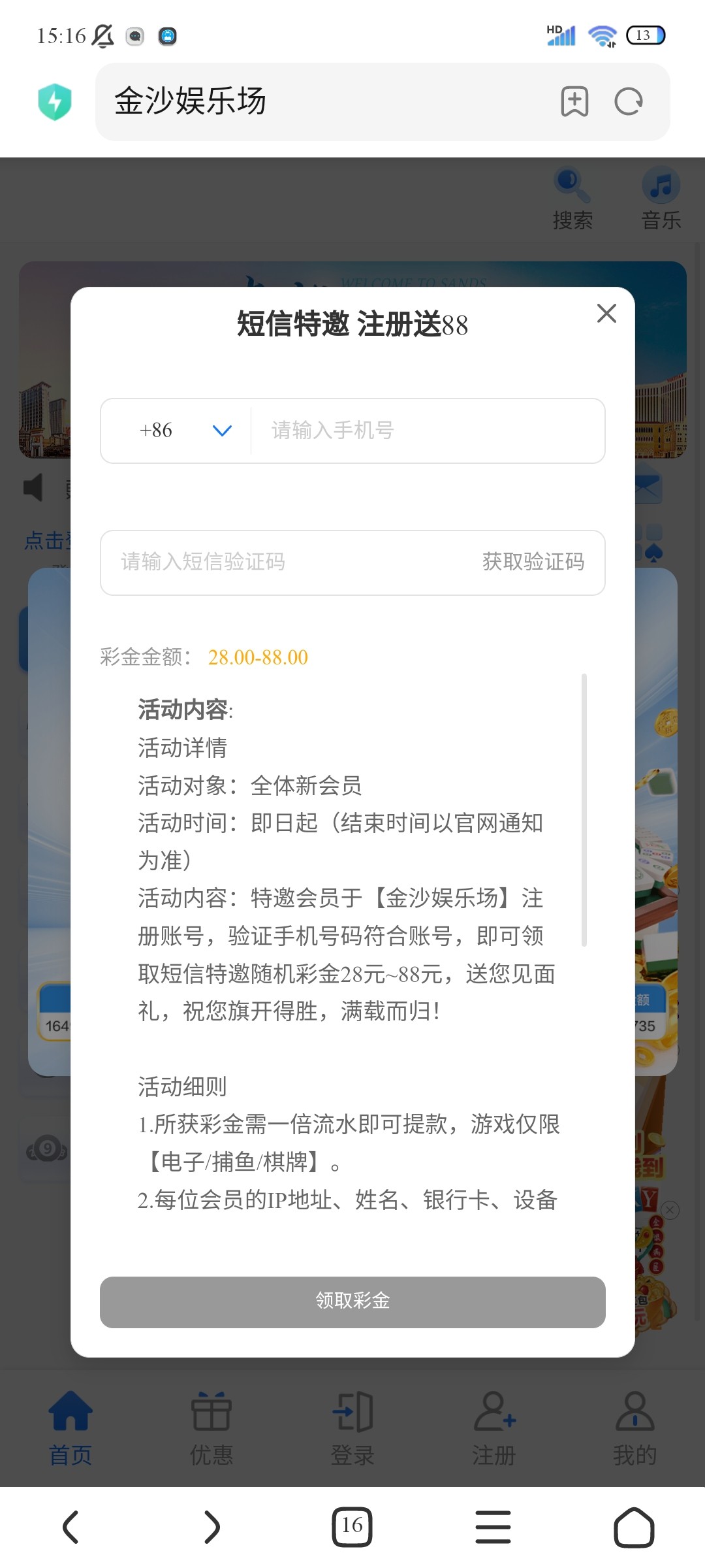新用户注册绑卡绑定手机号 优惠里自助验证手机号领取彩金 特邀碰瓷 领不了就不是特邀 无视即可 游戏和提款限制自行查看优惠