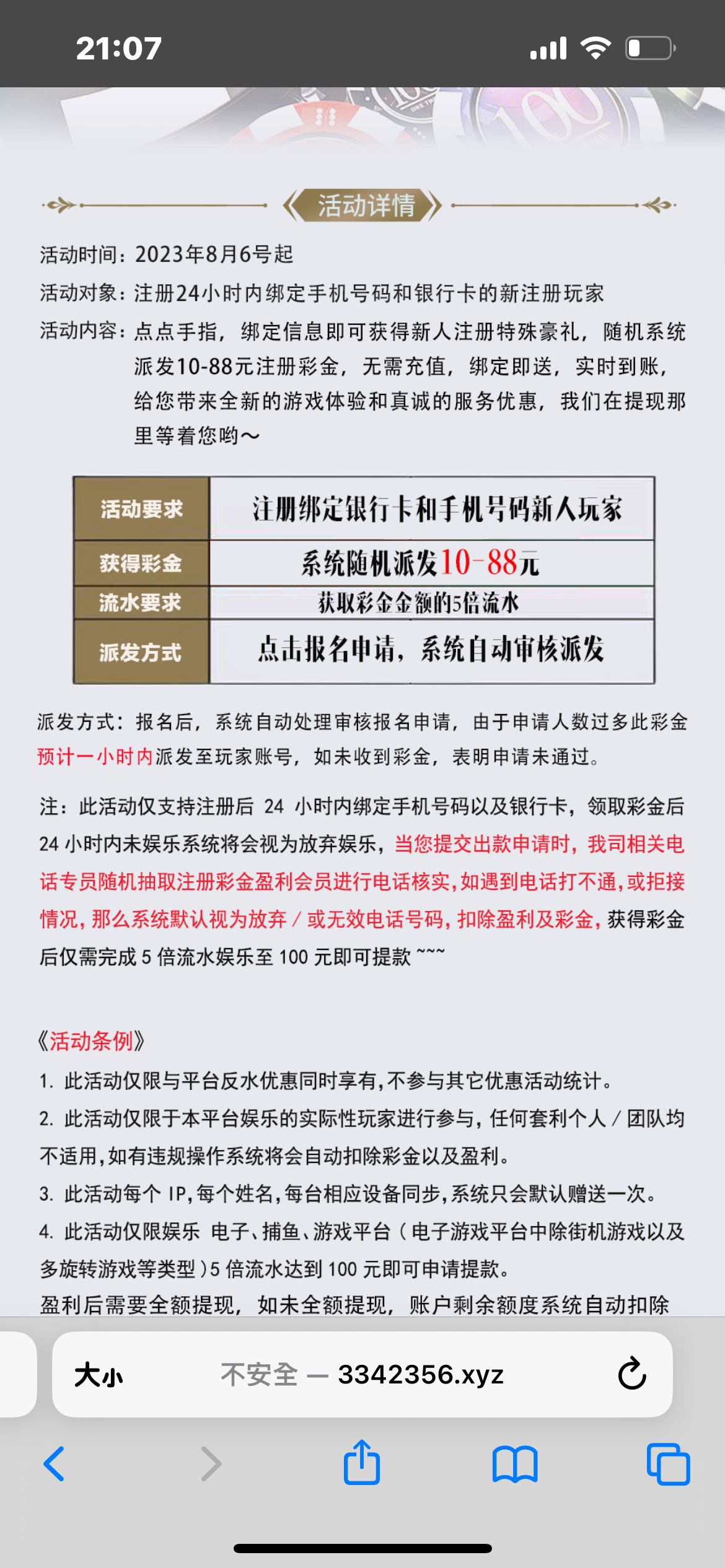 注册绑卡送10-88注册礼金 一般不会低于20 优惠里面报名申请 出款要一次性提完 不然会被扣除